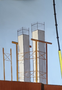 2020Bouwwerkzaamheden. Tegen een strakblauwe lucht steken de torens helder af. Zullen ze ooit de top bereiken en wat brengt de toekomst?